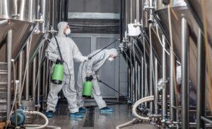 Craft brewery, eco product and disinfection. Workers in hazmat suits clean plant and kettles during quarantine, side view, free space